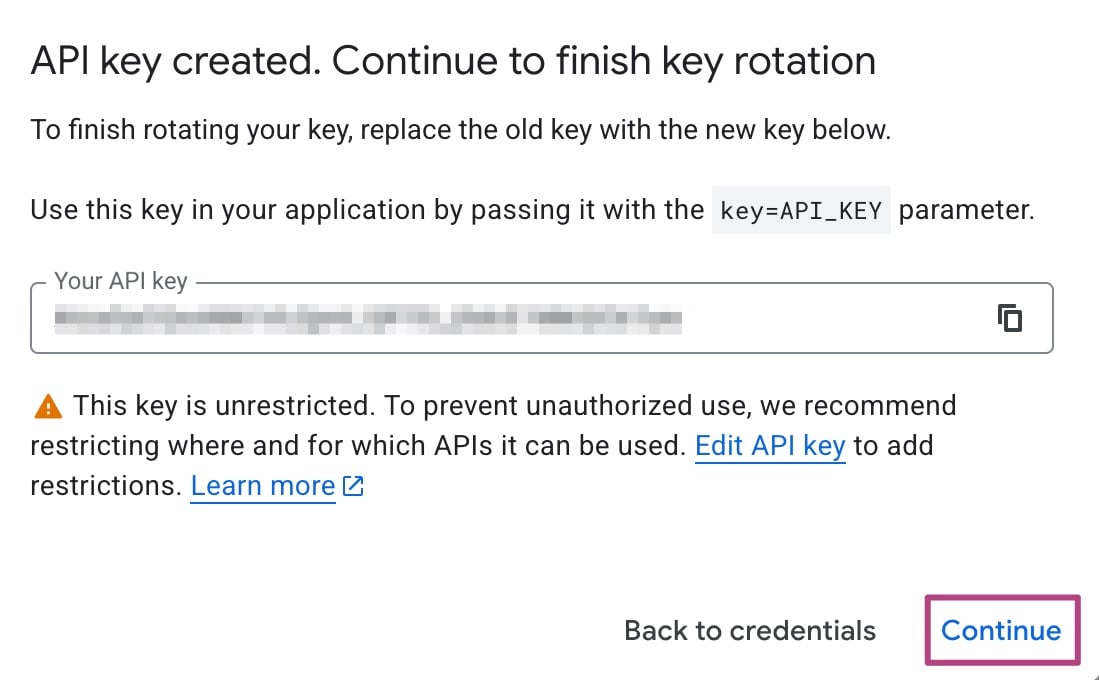 You may need to regenerate a key for a variety of reasons, especially if you notice another site is using your key. Please note that Google refers to this as rotate instead of regenerate.