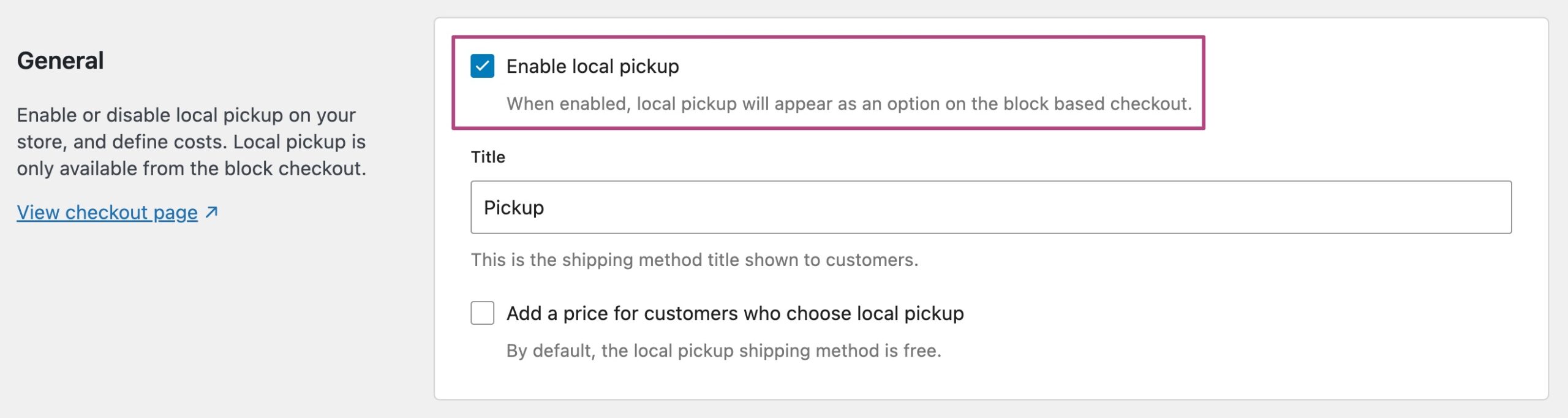 - Check that Local pickup is now an option under Shipping method