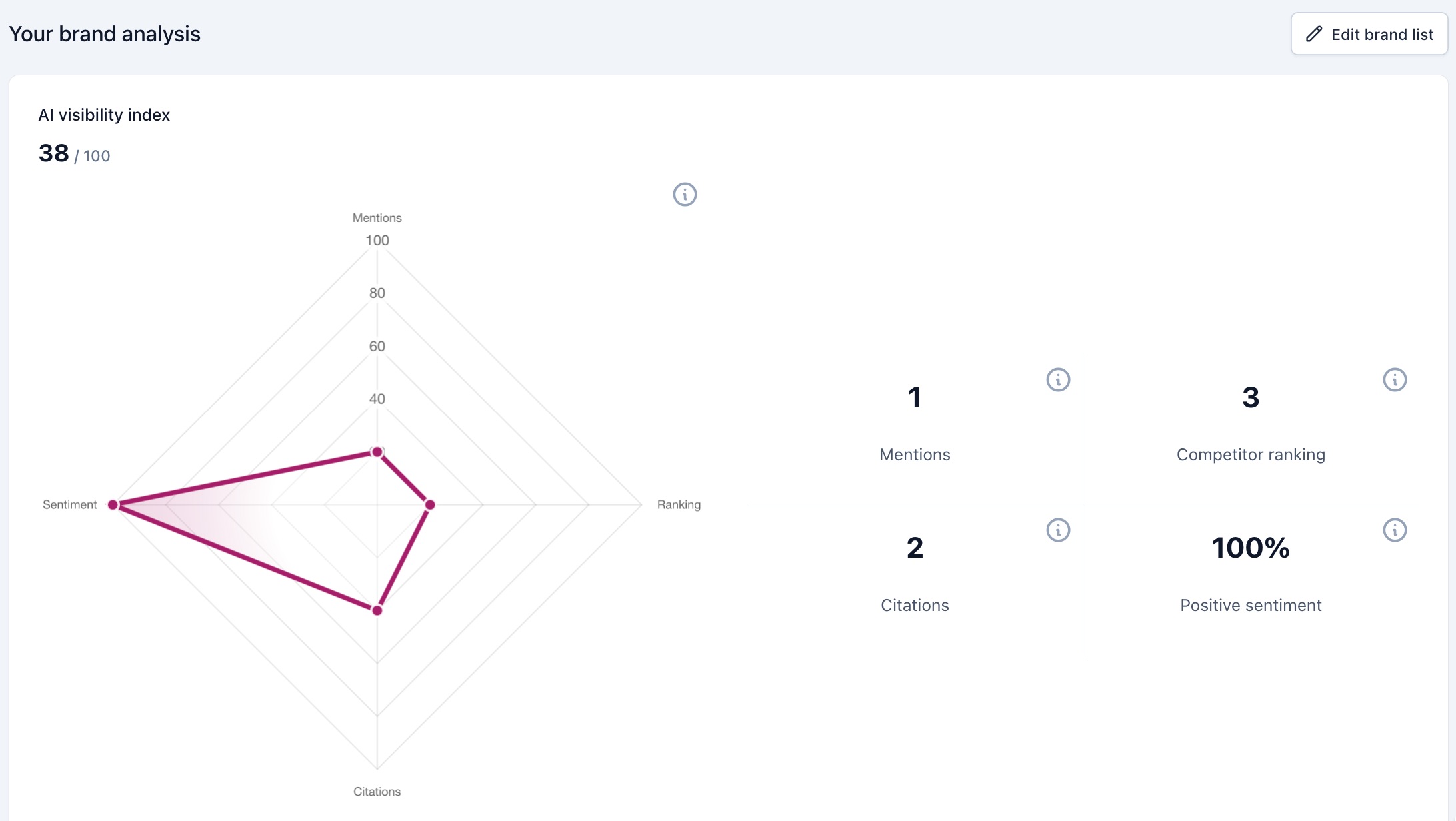 You can find information about the visibility, mentions, sentiment and citations about your brand, plus a ranking of your competitors.
