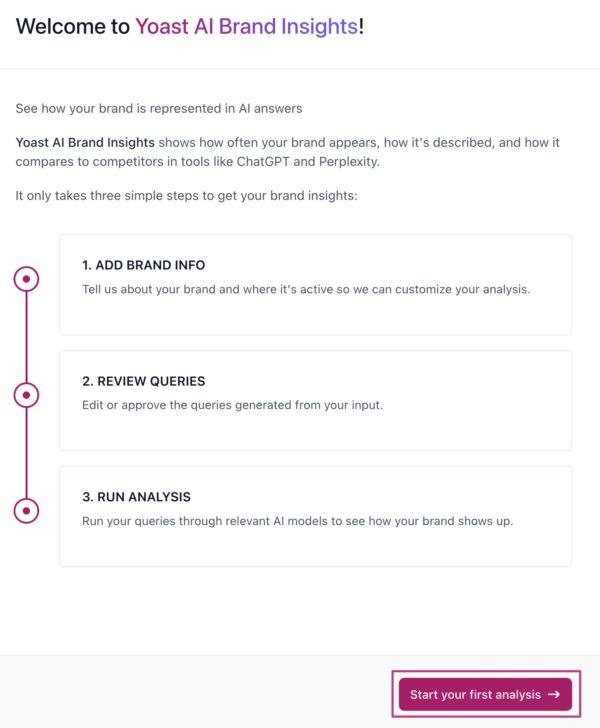 With Yoast AI Brand Insights, you can see how your brand is represented in AI answers. You can use this tool to see how your brand appears, and how it compares to competitors. In this article, we’ll explain where you can find Yoast AI Brand Insights, what information you should fill in, and how to run the brand analysis.