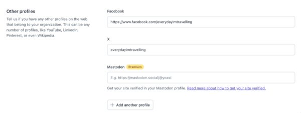Make sure to also add your other profiles under Site representation. The plugin will use that information to let search engines know which profiles are associated with your site.