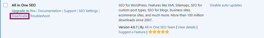 In the Plugins menu, find the All in One SEO plugin and click Deactivate to disable it.
