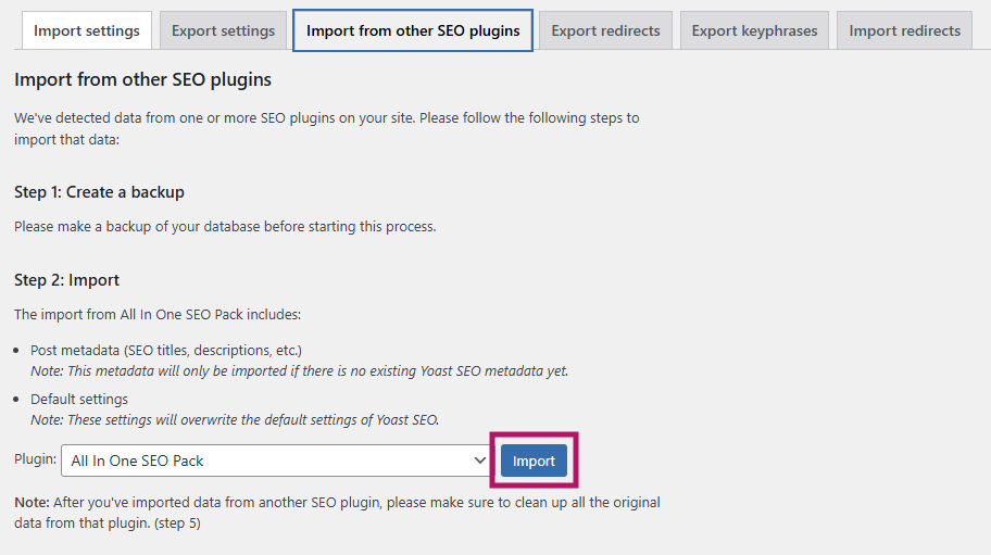 You have already completed Step 1 by backing up your data. Select the All in One SEO plugin in the drop-down menu and click on Import to migrate your data. It may take some time to import all the data: you will see a notification at the top of the screen when it is complete.