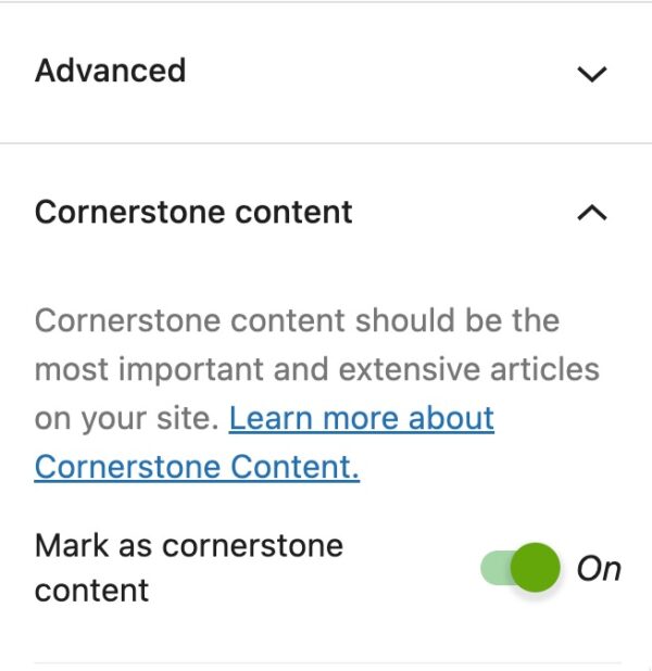 When you set a post as cornerstone content with the Yoast SEO settings in the sidebar, a few things happen. First, we adapt the SEO analysis and make it stricter, so it fits the needs of a cornerstone article. In Yoast SEO Premium, we also give priority to cornerstone articles in the linking suggestions. Finally, to make sure your cornerstone content doesn’t get stale, we include a stale cornerstone content filter.