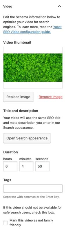 The title and the meta description for the video come from the information you fill in under Search appearance. If you do not add an SEO title, it will be pulled from the title of the page. Similarly, if you don’t specify a meta description, the plugin will automatically pull the first couple of lines of text on the page.
