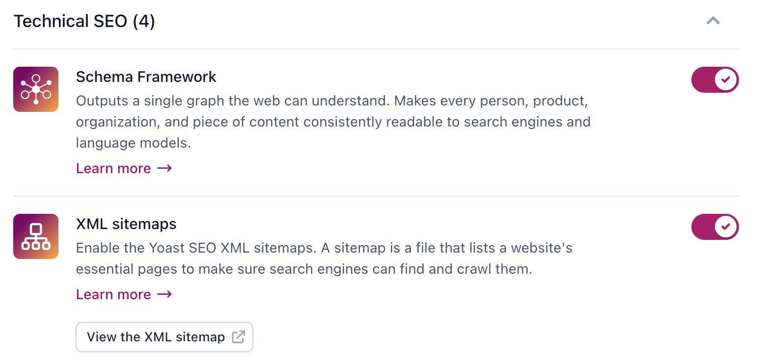 - Under Technical SEO, slide the XML sitemaps toggle to On