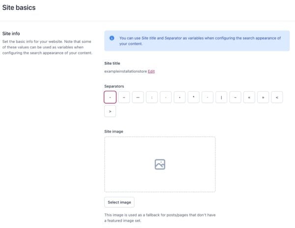 The Site title and Separator: this sets default template for the SEO title of your site, which appears in search results. It acts as a backup if you don’t fill in an SEO title for individual pages.