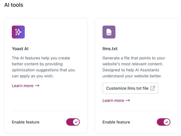 Under AI tools, you can enable or disable the Yoast AI features, as well as the llms.txt feature.