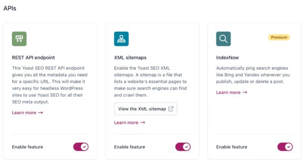 The final section in the Yoast SEO Site features settings is APIs.