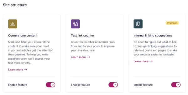 In this article, we’ll discuss the Yoast SEO Site features settings in your WordPress backend. In the Site features settings, you can enable or disable features within Yoast SEO for your entire site, such as he SEO analysis, the readability analysis, and the cornerstone content functionality.