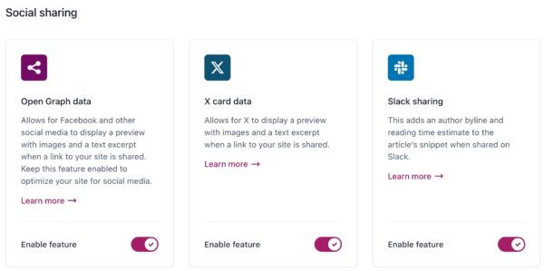 In addition to Open Graph data, X uses specific data to display information when your website’s content is shared on their platform: X card data. In the Site features settings, you can decide whether you want to output specific data for X or you want it to rely on just the social media data that you already gave it. It’s usually a good idea to keep this feature enabled.