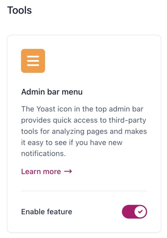 In this section, you have the option to turn on or off the Yoast SEO admin bar menu. This menu provides convenient access to third-party tools and resources and allows you to quickly check for new notifications from Yoast SEO.